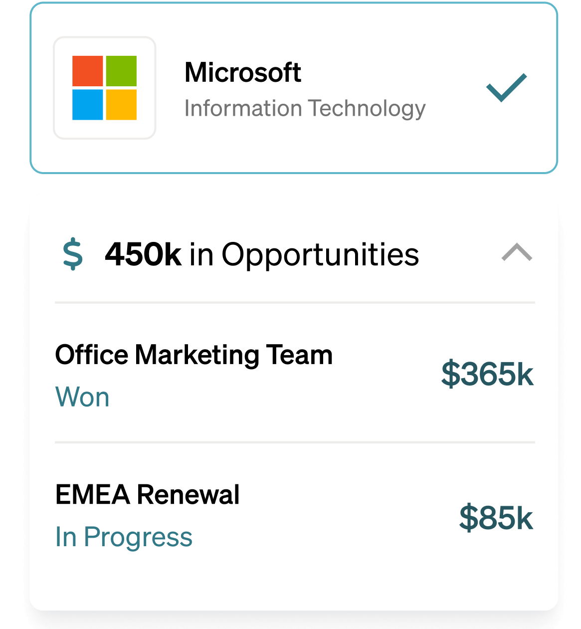 Gain in-depth insights on every account while prospecting — view past opportunities, see recent activity, and access saved contact records — all without opening Salesforce.