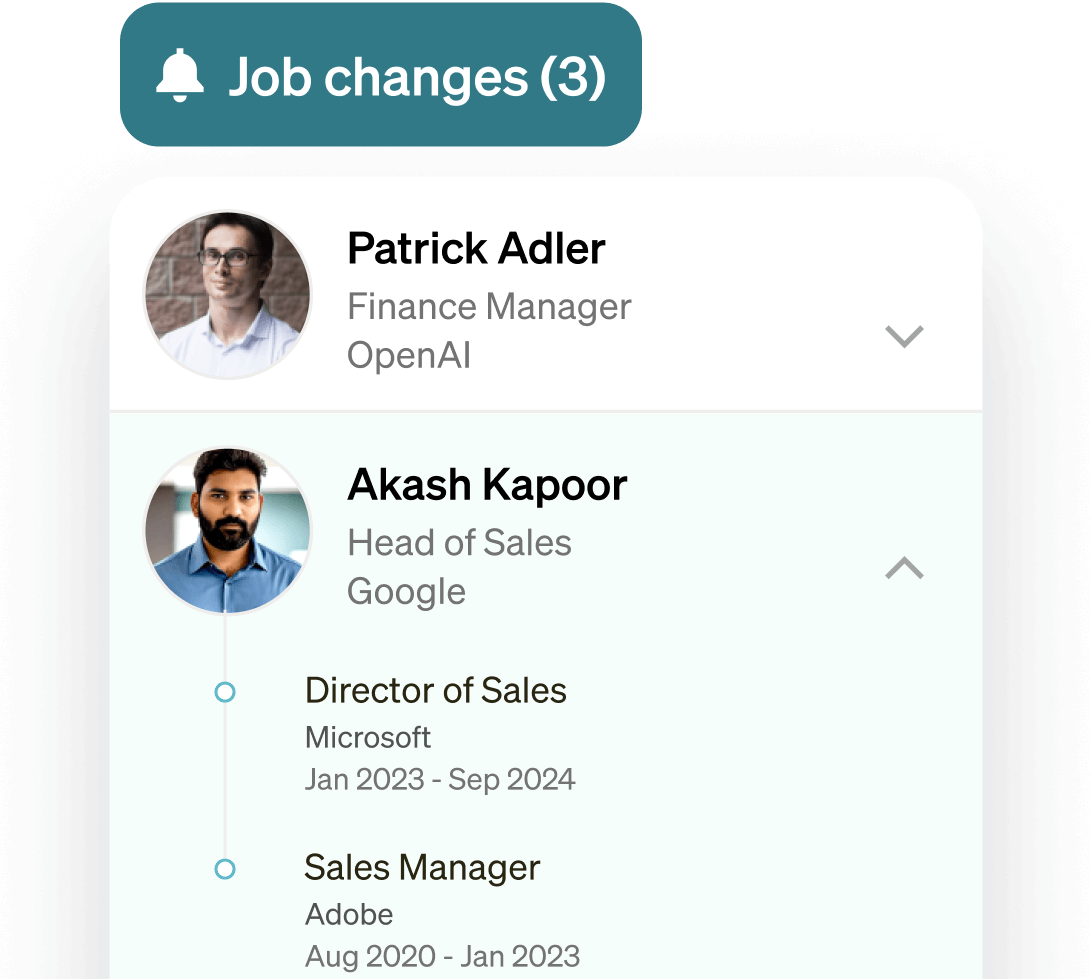 We continuously track and monitor all of your prospects for job changes and immediately alert you with any new job titles or company changes.